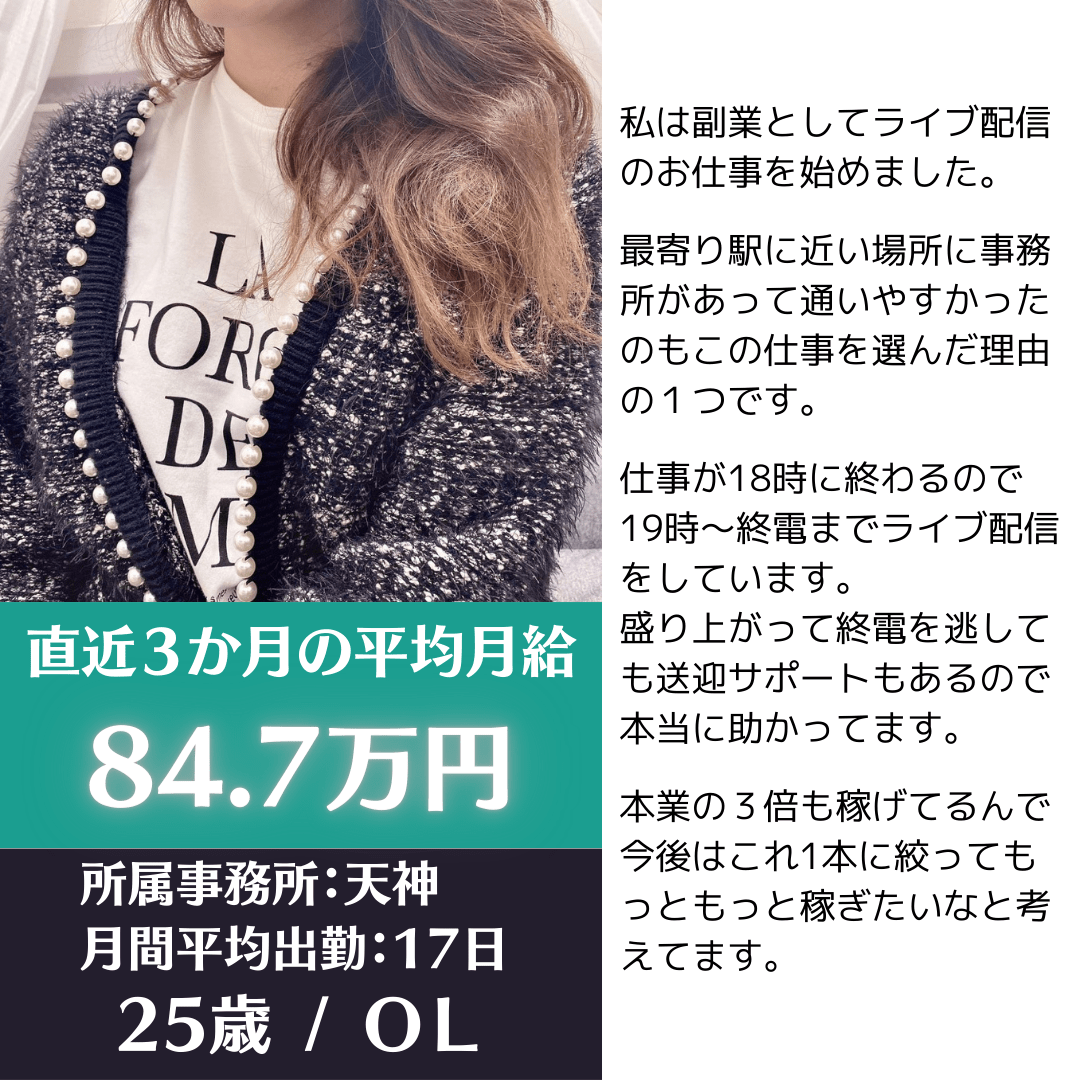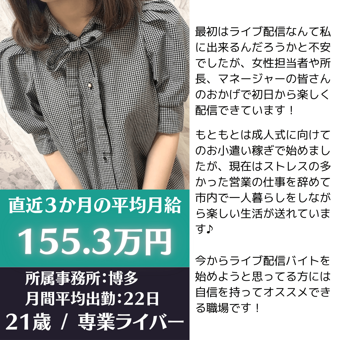 - スタジオ拡張により大分スタジオ、天神スタジオ、宮崎スタジオで新規ライバーさんを各30名ほど急募中!